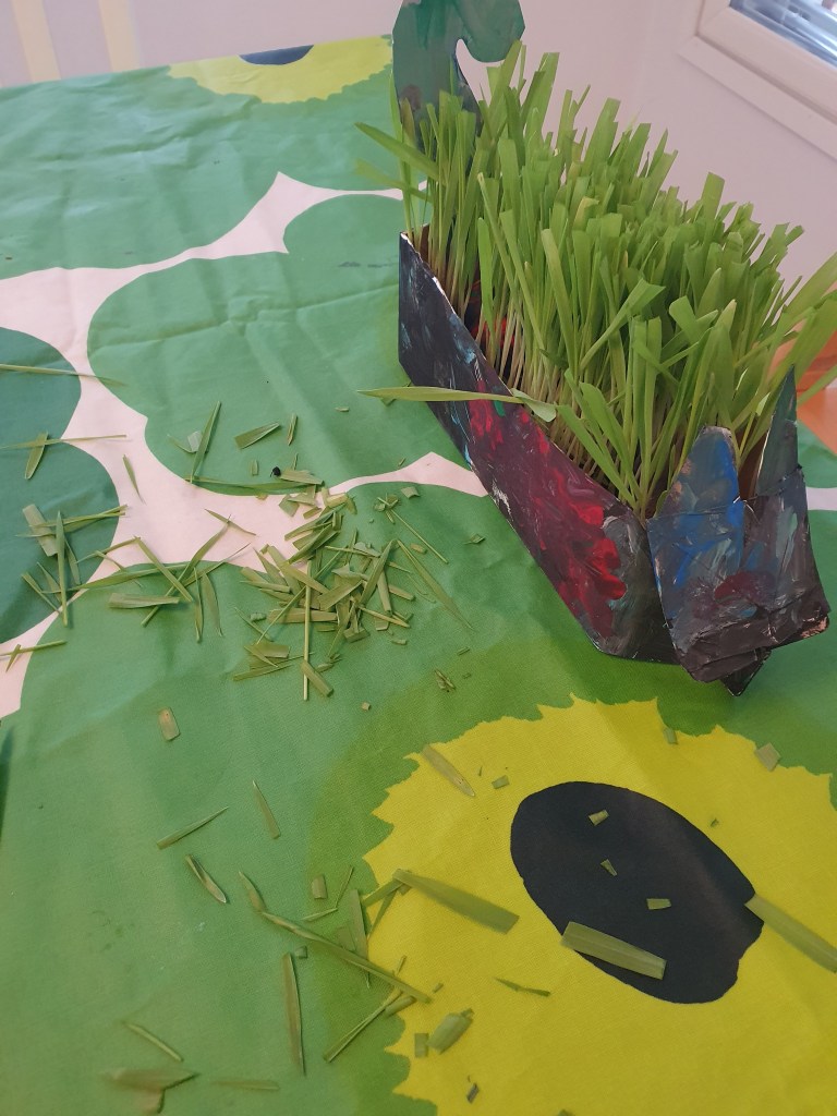 Il a vraiment neigé toute la matinée non stop, plus ou moins intensivement donc ça ne risquait pas de disparaitre mais vers 15H30 le soleil est apparu entraînant la fonte de la neige notamment sur les toits et alors au retour Aapo voulait jouer avec l’eau (je vous rappelle que c’est son jeu préféré quand nous sommes dehors). En même temps ça coulait super vite dans les gouttière donc plutôt amusant, il a coincé la pelle en dessous et ça faisait sortir l’eau, il m’a demandé de la tenir pour qu’il aille voir jusqu’où l’eau allait, loin loin loin dans la neige et qui devenait ensuite de la soupe. Nous avons changé de gouttière, lui toujours avec sa pelle et moi avec Luna en laisse qui avait besoin de faire un tour dehors. Tatu est rentré ce jeudi de presque 2 semaines de travail à Kajaani tandis que le matin avec Aapo nous avions pris notre temps pour faire une petite coupe à son chat-herbe !