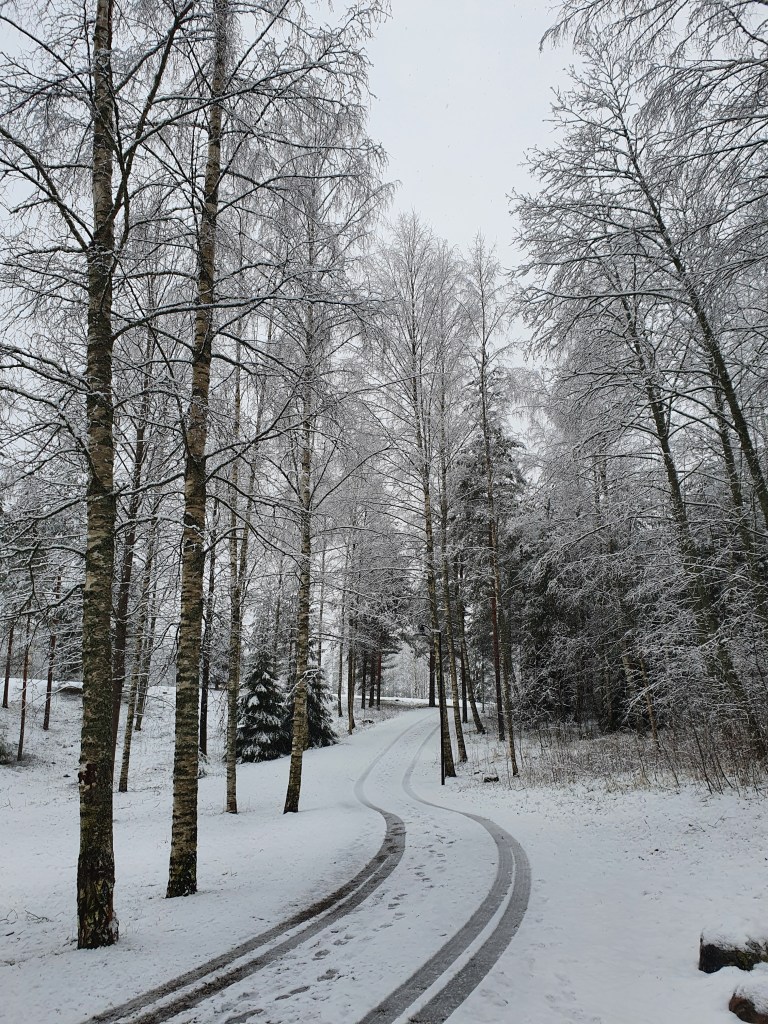 Jeudi matin en ouvrant la fenêtre je n’ai pas pensé à regarder dehors (oui ma fenêtre est toute petite, en hauteur et je ne vois donc que les branches des arbres) et c’est en ouvrant la porte que j’ai eu la joie de découvrir à nouveau qu’il avait neigé mais plus que la veille cependant. Anne-Mari m’a demandé si j’avais besoin de la voiture car elle voulait la prendre (la sienne n’a plus de pneus d’hiver) car la route était complètement recouverte alors ça devait glisser. Je passe mes journées à la maison alors fait toi plaisir j’ai envie de dire ! En emmenant Aapo nous nous sommes rendus compte que y en avait une sacrée quantité, je pense environ 5 ou 6 cm. Nous avons pris notre temps pour aller jusqu’au jardin d’enfants, Aapo a fait des boules de neige, des tracés avec son bâton.
